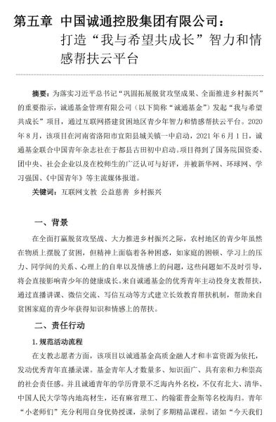 9月18日,由国务院国资委主办、中国社会责任百人论坛承办的“责任创造价值,责任引领未来——中央企业社会责任报告集中发布活动(2021)”在京召开。会上,发布了《中央企业社会责任蓝皮书(2021)》,《中国诚通控股集团有限公司:打造“我与希望共成长”智力和情感帮扶云平台》成功入选。
